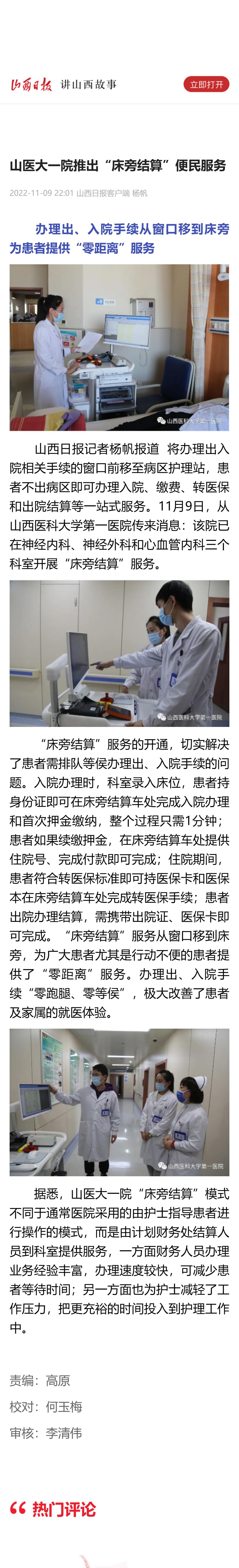 山西日报|山医大一院推出“床旁结算”便民服务