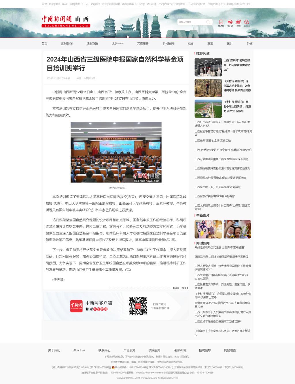中国新闻网山西|2024年山西省三级医院申报国家自然科学基金项目培训班举行