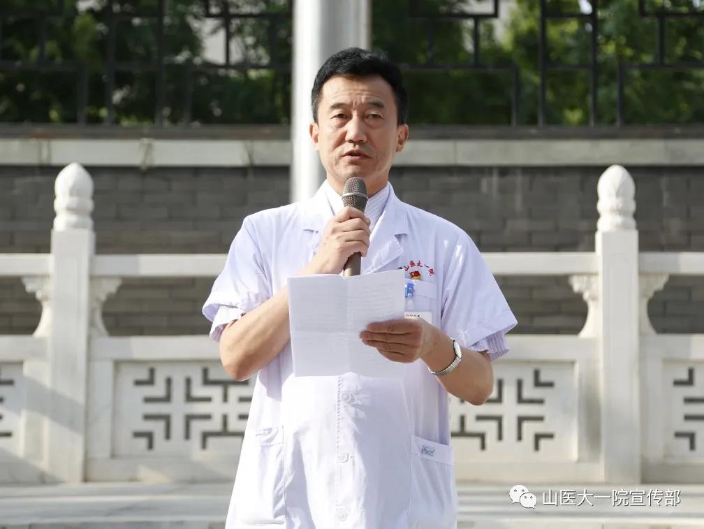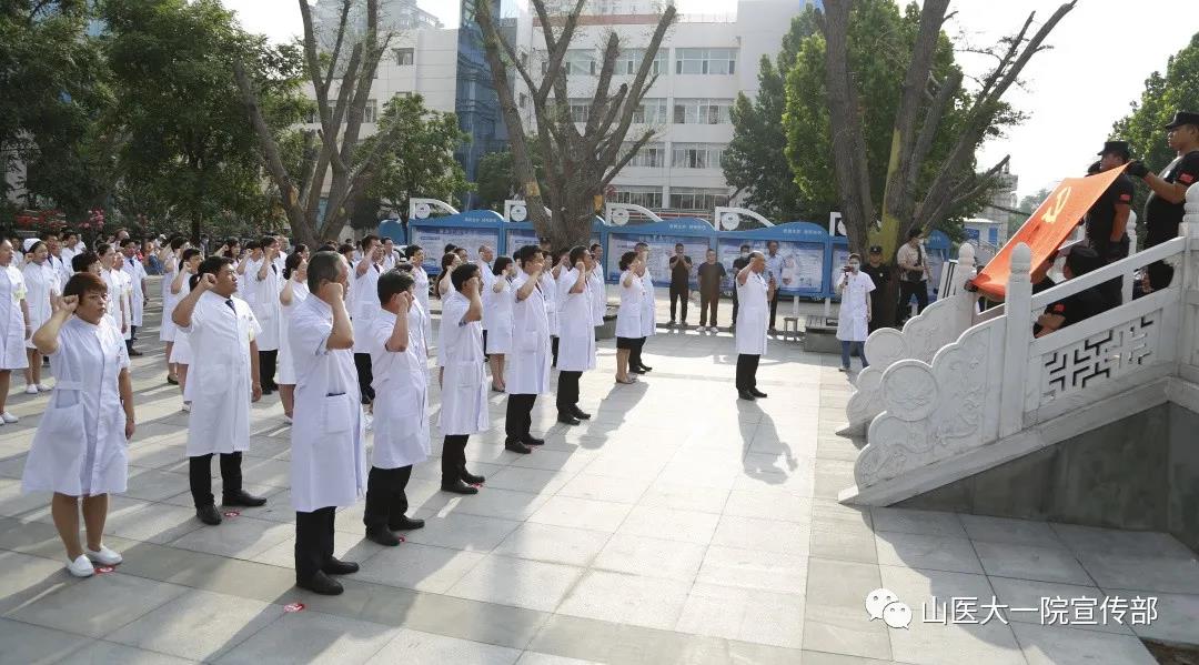 在一号住院楼前广场举行庆祝建党99周年新党员入党宣誓暨老党员重温入党誓词仪式。全体在院领导、2020年新发展党员、在抗击新冠疫情一线入党的党员、老党员代表100余人参加宣誓仪式。院党委副书记、院长徐钧主持仪式。
