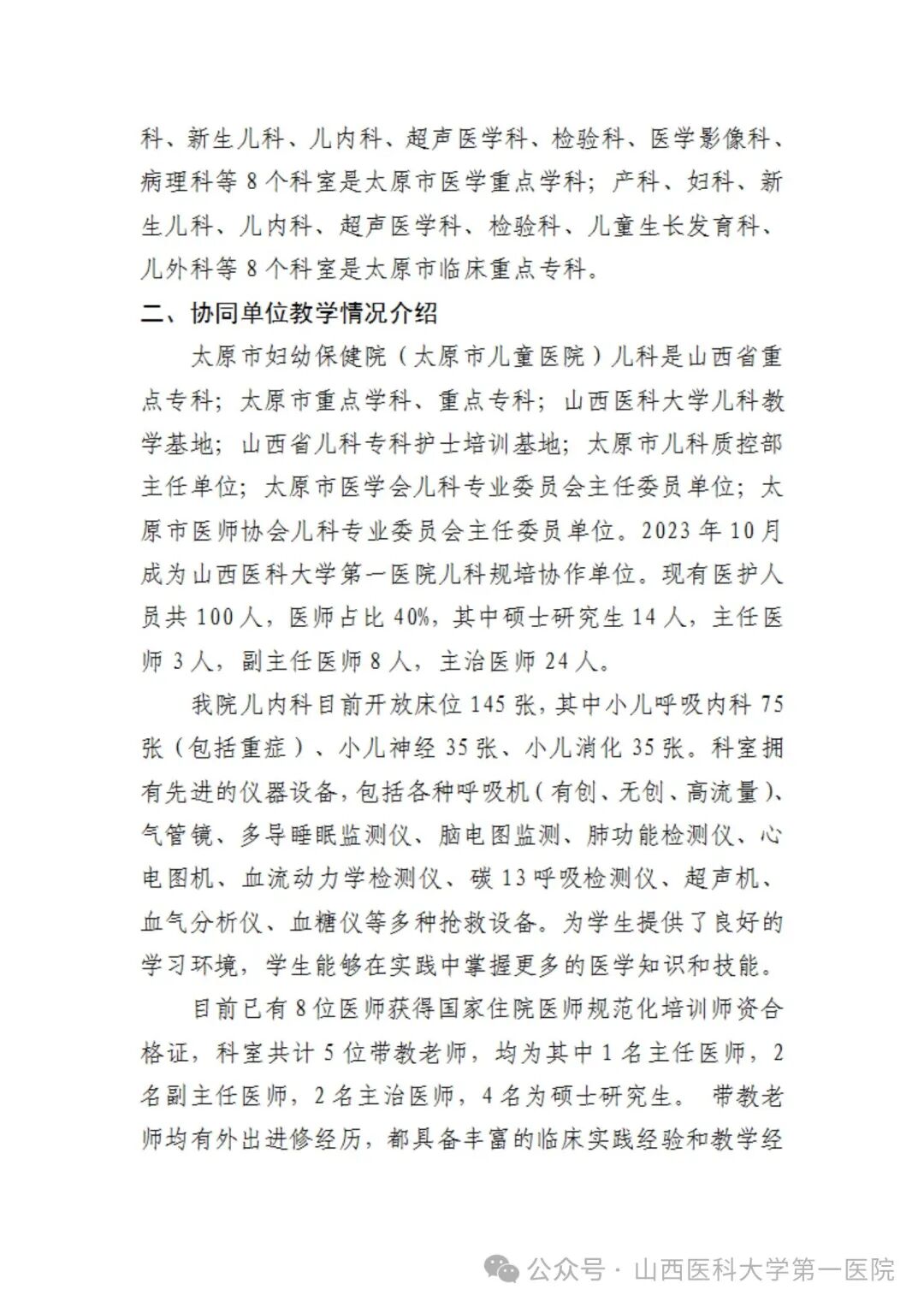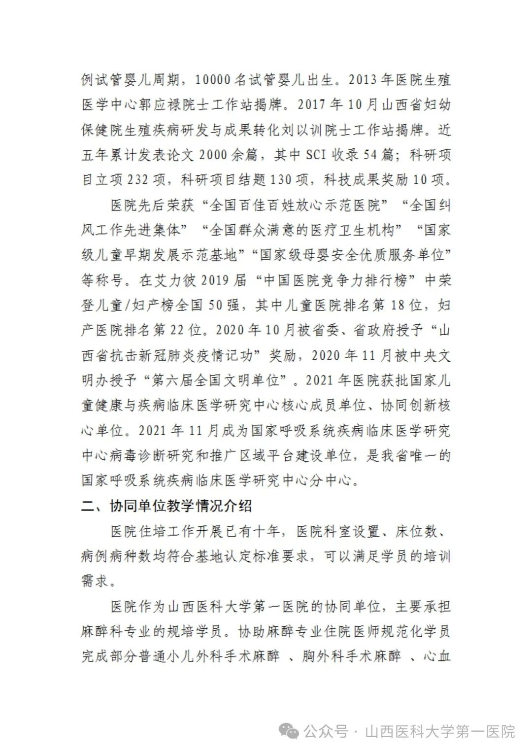 医院作为山西医科大学的教学机构,拥有雄厚师资力量,是首批国家临床教学培训示范中心、全国住院医师规范化培训基地,是国家临床医学博士后科研工作站及博士后科研流动站,承担着“5+3”一体化、本科生、研究生、留学生、住院医师培训和专科医师培训的教学工作。硕士学位授权点覆盖医院所有医疗、医技学科;临床医学专业为国家级品牌特色专业,获批国家级一流本科专业建设点;现有国家级优秀教学团队1个,国家级实验教学示范中心1个,教育部高等学校教学指导委员会委员3人。