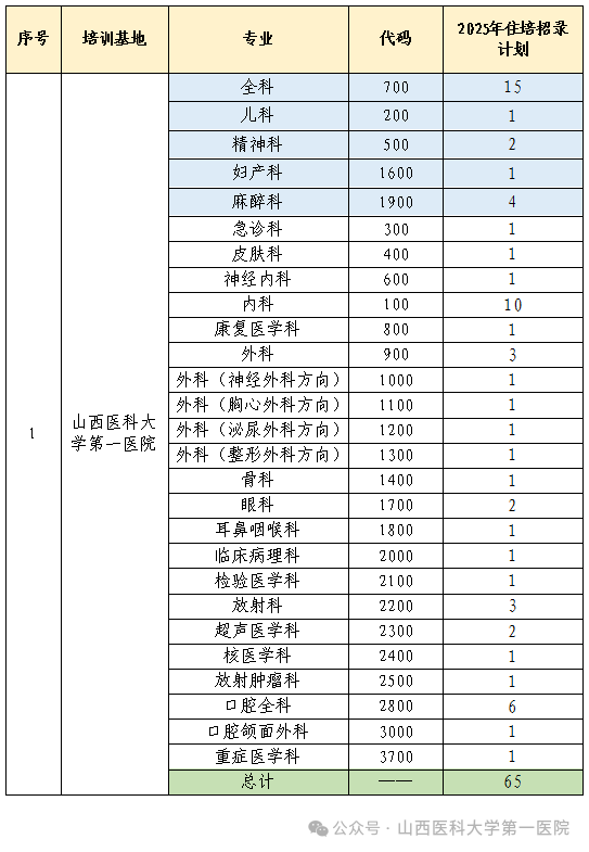 2025年山医大一院住院医师规范化培训招收专业及人数情况,详见下表: