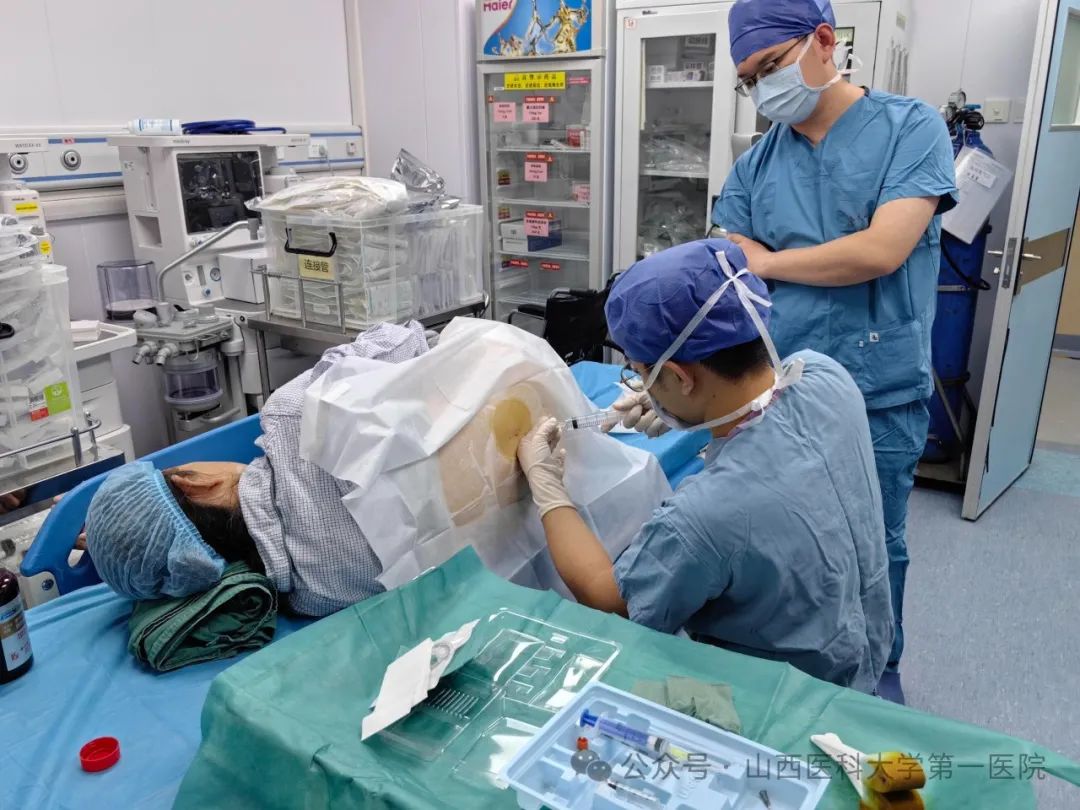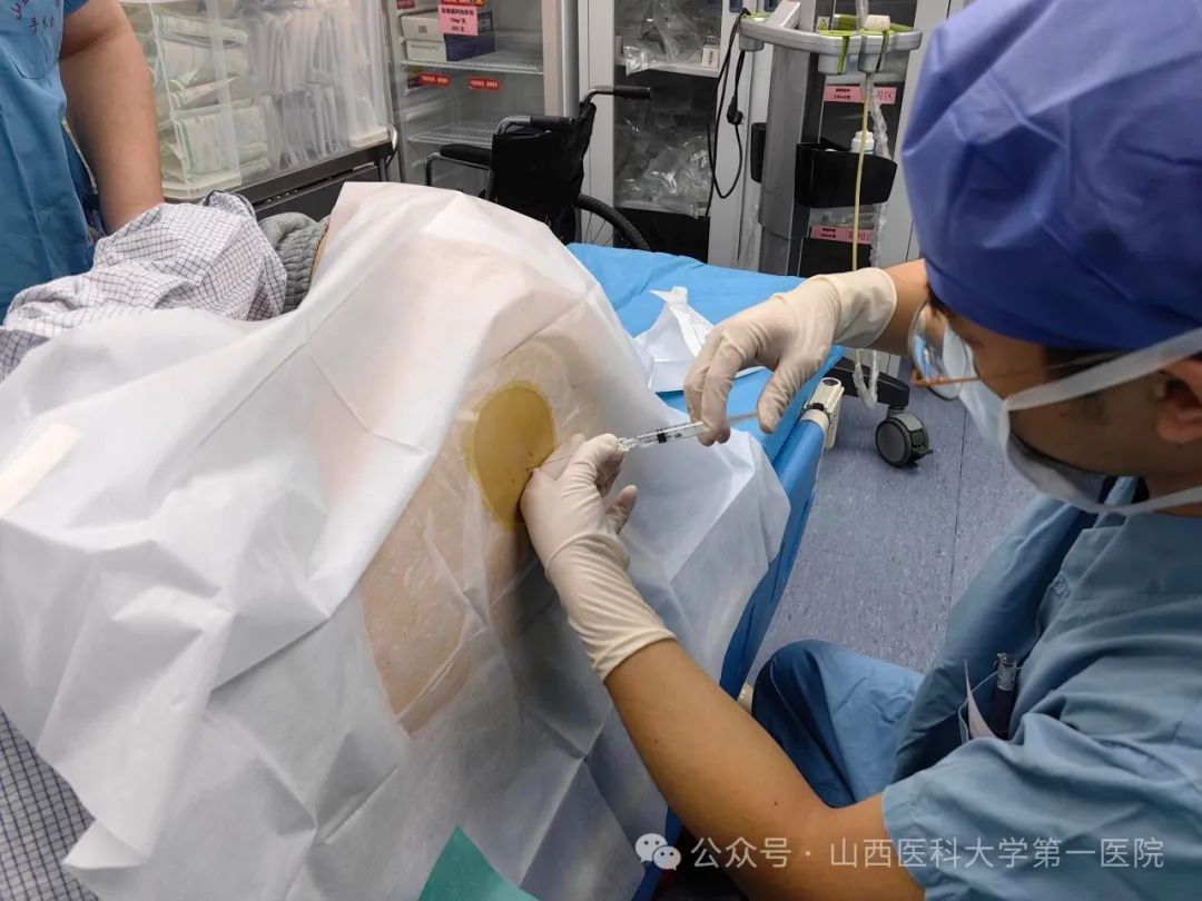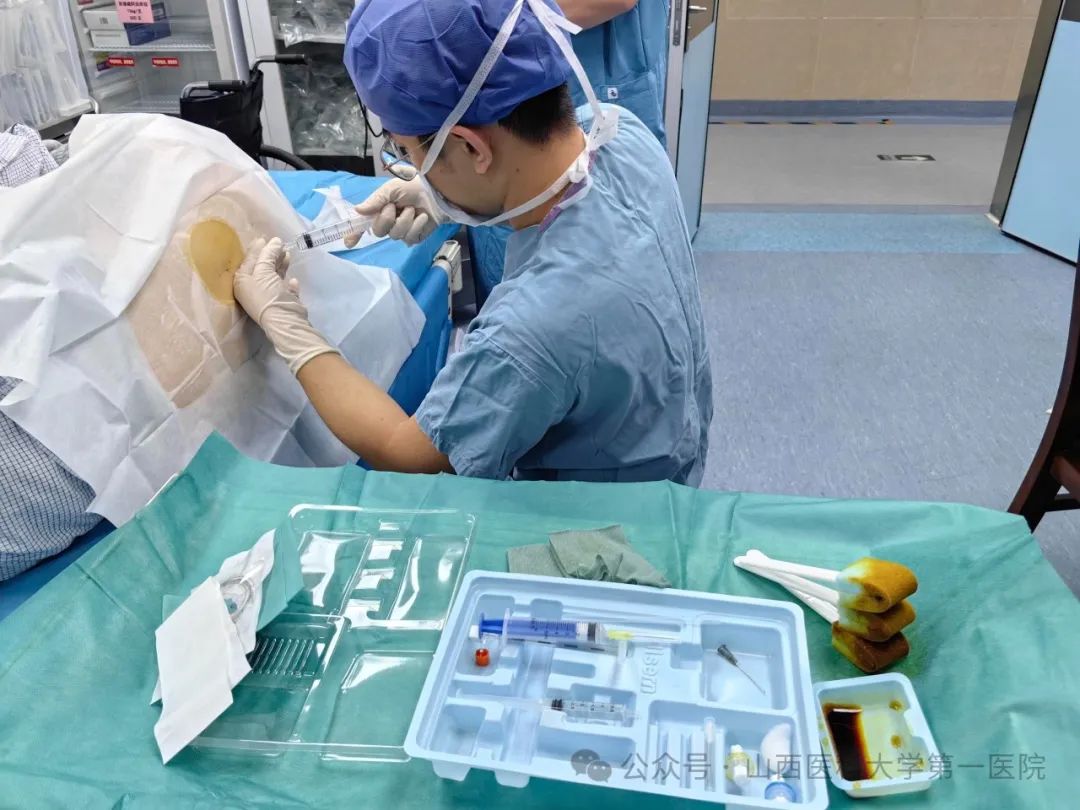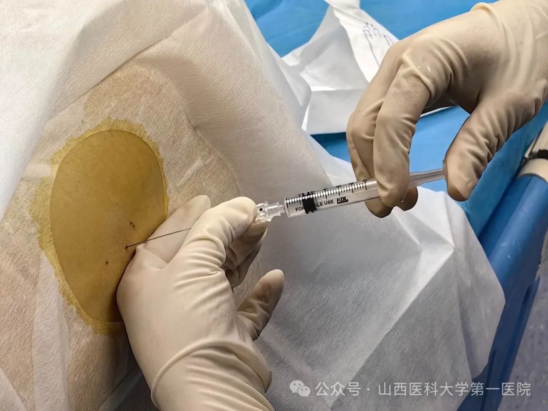 入院后经过针对性检查,确诊为纵隔恶性肿瘤软脑膜转移。经过肿瘤综合科医护团队反复讨论,与患者家属深入沟通,征求知情同意后,3月27日,肿瘤综合科联合麻醉科成功实施鞘内注射抗肿瘤靶向药物,麻醉科张亚阳在治疗过程中使用了一次性麻醉穿刺包,明显减少了创伤,开辟了新的治疗途径。