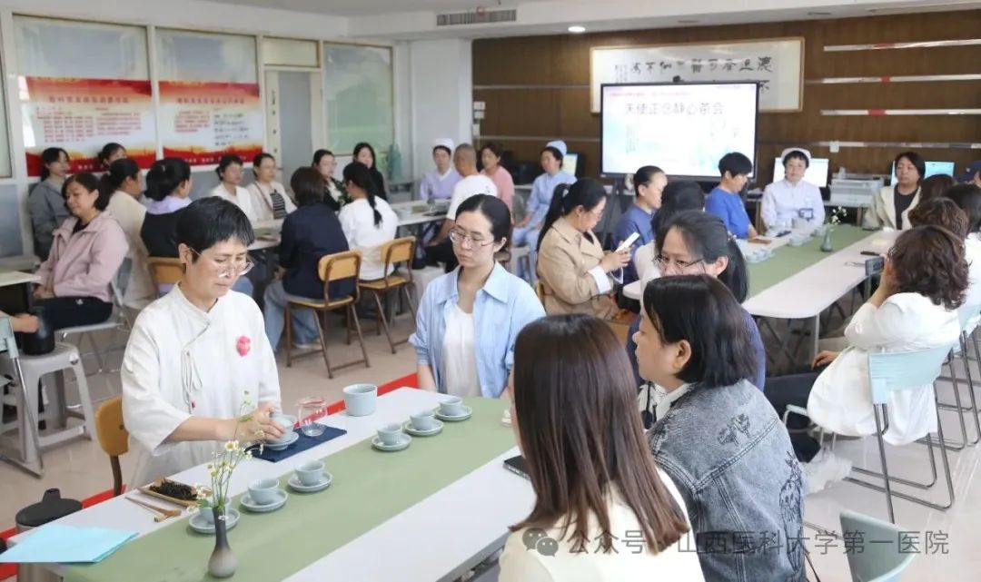 护理部以“静心茶语,守护生命之光”为主题举办了“天使静心茶会”,山西省中医药研究院心理治疗师赵淑琴、静心茶社专业茶艺师团队及60余名护士参加。