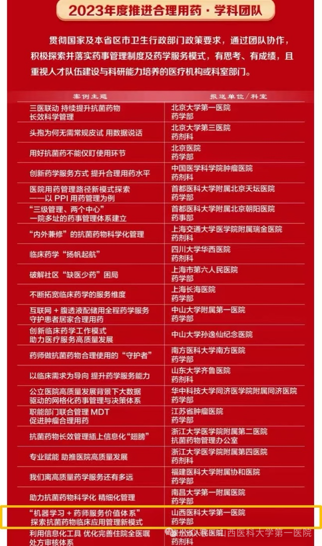 基地依托药学部“药学服务、科研、教学”三位一体的发展战略,积极推动以教学促药学科研能力建设策略方案。近年来,临床药师参与完成多项省级和市级课题,发表高质量论文数十篇,涵盖处方前置审核模型构建、特殊人群用药风险预警、抗菌药物智能监管等研究方向,其中,《合理用药评估模型在医院药事服务能力评估中的应用》荣获多项国家级奖项,展示了基地将临床实践、教学培训与科研创新深度融合的能力。同时还注重对外交流与合作,积极参与国家药学技术能力培训、全国临床药师师资培训,主办省内学术会议和教材编写等工作,多位临床药师受邀担任高校授课教师或学术评审专家,为山西药学教育体系建设贡献了专业力量。