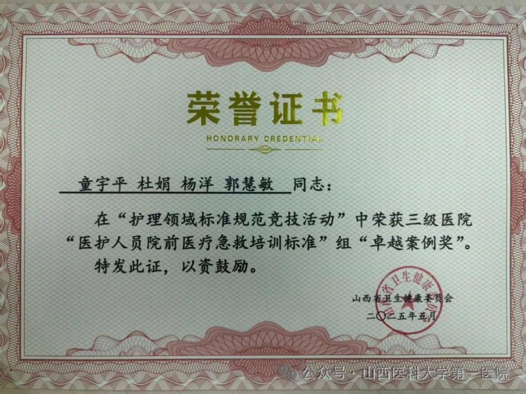 急诊医学中心科护士长童宇平携杜娟护士长、杨洋护士、郭慧敏护士等团队成员提报的《贯标铸盾,救在分秒——基于WS/T839行标的院前急救专业化能力提升行动》案例荣获该赛道组第一名,获评卓越案例奖。