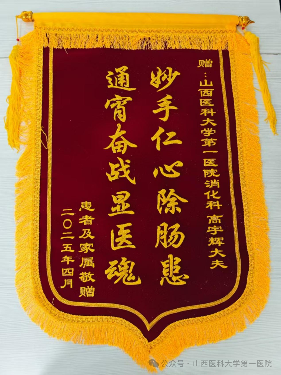 消化内科高宇辉团队完成山西省首例内镜下经盲肠阑尾切除术(Endoscopic transcecal appendectomy,ETA),术后患者恢复良好,于4月29日顺利出院,家属专程送来锦旗表示感谢。