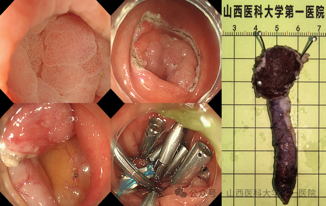 在科主任陈星和护士长张娜的积极协调沟通下,在麻醉科团队、手术室团队以及胃肠外科总住院医师陈浩团队的保驾护航下,消化内科高宇辉和团队成员王晓楠、王晓红、原泽鹏严格按照术前制定的策略进行手术,注射、环周切开、开窗、牵引、游离阑尾系膜、止血、缝合,最终手术顺利完成。术后36小时,患者下地活动,平安出院。术后病理结果回报为盲肠低级别管状腺瘤,局灶高级别(早癌),慢性阑尾炎,切缘阴性。