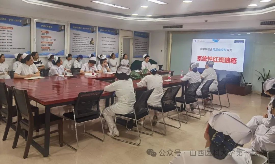 本次多学科联合查房内容为一例胃穿孔术后合并系统性红斑狼疮(SLE)、甲状腺功能减退、肝硬化、股骨头坏死及焦虑症等多种疾病的重症患者。首先,胃肠外科护士长崔映琴说明了本次多学科护理查房的目的,梳理了查房流程。接着,责任护士详细介绍了患者病情、治疗经过、护理问题及措施,提出需要解决的问题。随后,各科室护理专家紧扣患者急待解决的免疫系统“失控”——SLE急性发作、代谢危机——甲减未控制、肝硬化导致白蛋白低、股骨头坏死致无法行走、焦虑等问题提出针对性护理措施,展现了多学科协作在危重症患者管理中的核心价值。
