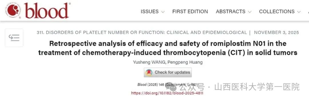 肿瘤消化科王育生教授团队的一项临床研究成果在会上精彩亮相,并被顶级医学期刊《BLOOD》收录。团队发表的关于罗普司亭N01治疗实体瘤患者化疗相关血小板减少症(CIT)的回顾性研究摘要(abs25-4679),以其突出的数据引发了学界关注,为CIT的临床管理提供了新的重要证据。