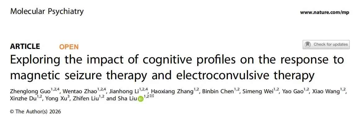 刘莎教授团队发表了题为“Exploring the impact of cognitive profiles on the response to magnetic seizure therapy and electroconvulsive therapy”的研究论文。该研究基于较大规模的精神分裂症与抑郁症临床样本,首次从认知剖面分型视角,对比了磁惊厥治疗(Magnetic seizure therapy, MST)与电休克治疗(Electroconvulsive therapy, ECT)的疗效差异,揭示了认知剖面特征对惊厥治疗反应的影响。研究发现,MST与ECT总体疗效相当,MST在信息处理速度等方面认知保护优势更明显;基线认知剖面可显著影响ECT疗效,而MST在不同认知特征患者中均疗效稳定。该研究是国内较早开展、且首个基于国产MST设备发表的临床研究,也是首次从认知剖面探讨两种惊厥治疗差异的对照研究,为精神疾病患者制定个体化惊厥治疗方案提供了重要依据。博士生郭政隆、研究实习员赵文涛、主任医师李剑虹为该论文的共同第一作者,刘莎教授为通讯作者。