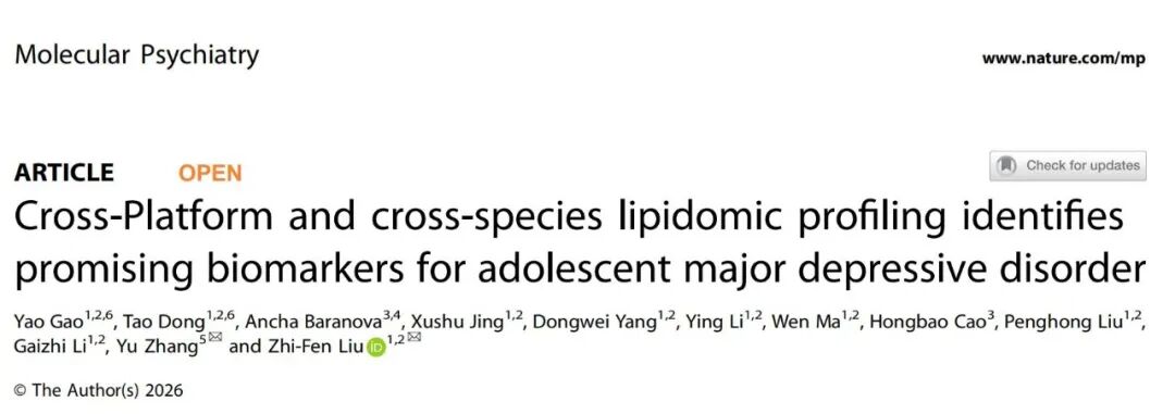 刘志芬教授团队与山西医科大学基础医学院张宇教授团队开展跨学科合作,发表题为“Cross-Platform and Cross-Species Lipidomic Profiling Identifies Promising Biomarkers for Adolescent Major Depressive Disorder”的研究论文。该研究针对青少年抑郁症客观诊断难题,基于临床样本与动物模型开展跨平台、跨物种脂质组学分析,成功鉴定出一组稳定可靠的脂质生物标志物。研究显示,29种脂质组合面板交叉验证准确率达90.4%,7种脂质子集准确率高达94.8%;独立验证队列中,由LPA (18:2)与SPH (d16:1)组成的最小标志物组合准确率达 72.1%。跨物种验证进一步证实,鞘脂SPH (d16:1)在人与大鼠中均显著下调,相关脂质代谢通路异常与抑郁发生密切相关。该成果为青少年抑郁症早期精准诊断与靶向干预提供了重要依据。高耀副教授、博士生董涛为该论文的共同第一作者,刘志芬教授与张宇教授为共同通讯作者。