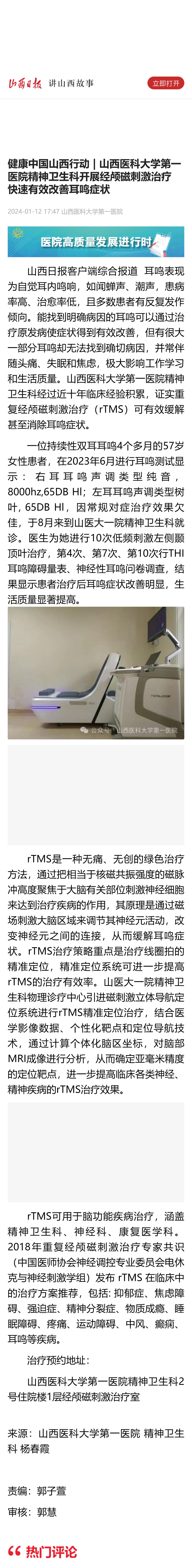 山西日报客户端|健康中国山西行动 | 51风流 精神卫生科开展经颅磁刺激治疗 快速有效改善耳鸣症状