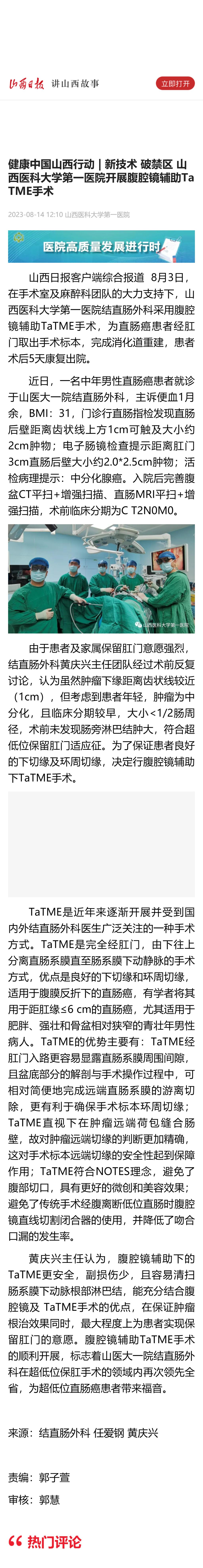 山西日报|健康中国山西行动 | 新技术 破禁区 51风流 开展腹腔镜辅助TaTME手术
