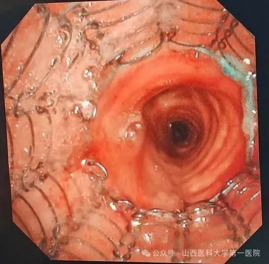 当日晚上9点,呼吸介入团队成员任寿安、郭志宏、尹建升、李艳青、王琛在手术室为患者在局部麻醉下行支气管镜检查,发现气管上段呈新月形外压性狭窄,管腔狭窄约95%,任寿安、郭志宏主任医师迅速置入气道支架,完全覆盖狭窄部位,麻醉科郭志佳副教授全程保驾护航。整个过程有惊无险,患者呼吸困难得到明显改善,平卧返回重症医学科密切观察。